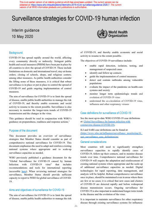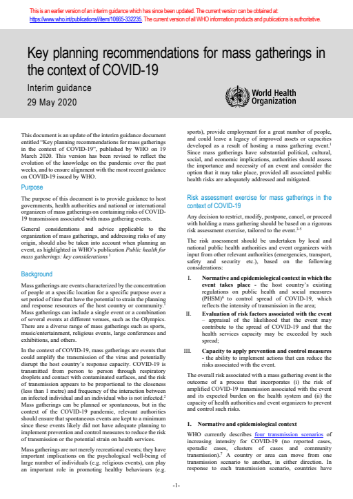 This is the fourth version (third update) of this interim document. First published on 14 February 2020 as Key planning recommendations for mass gatherings in the context of the current COVID-19 outbreak , it has been updated on 19 March 2020 and on 29 May 2020 prior to this version. The current version of all WHO information products and publications is authoritative."