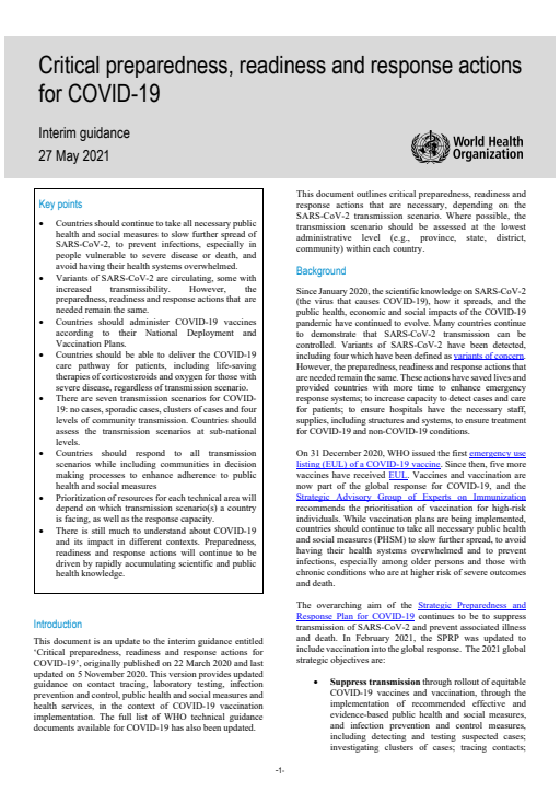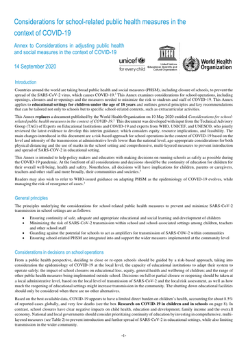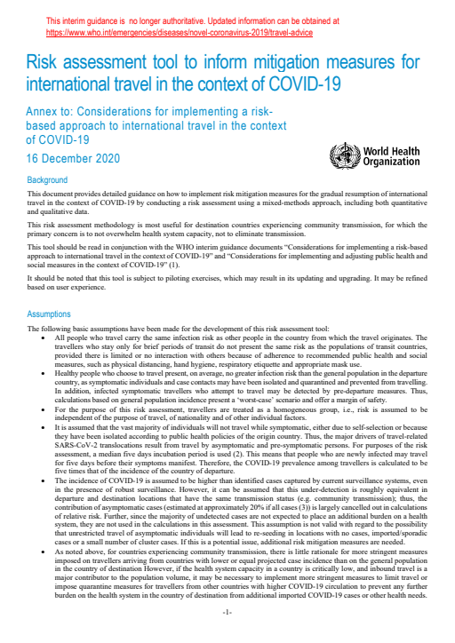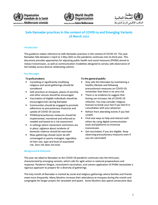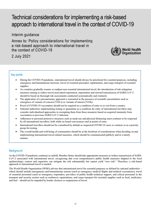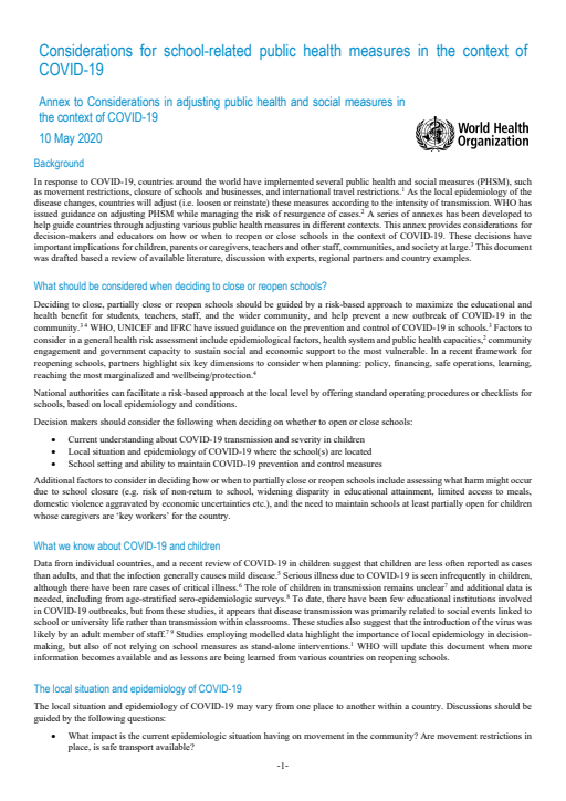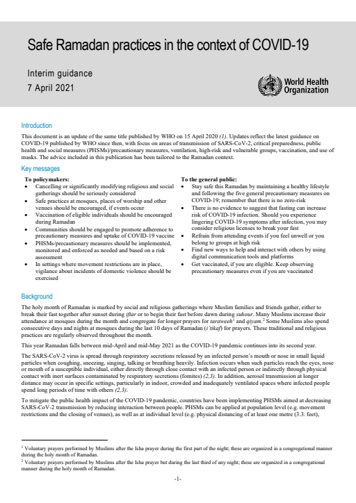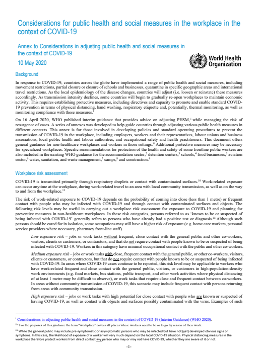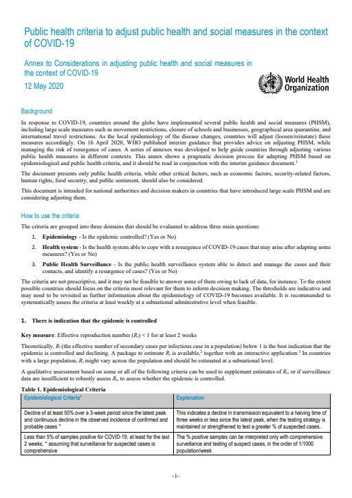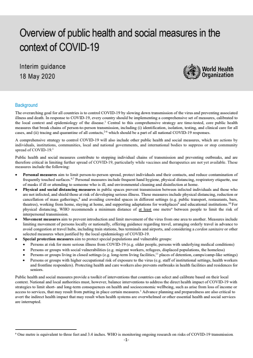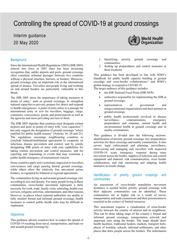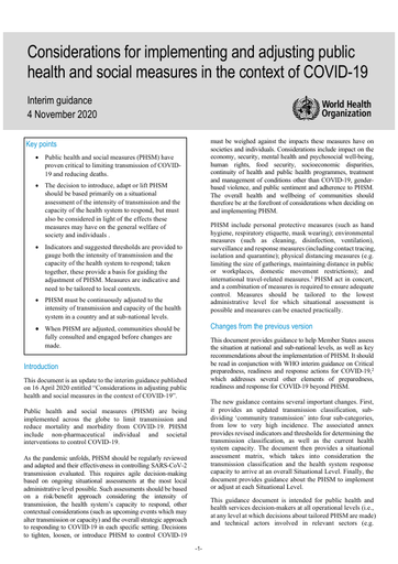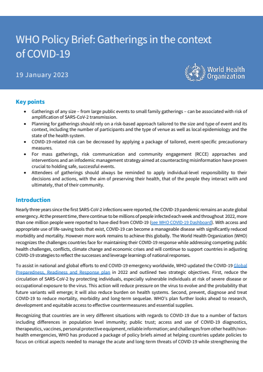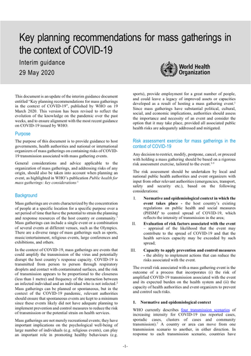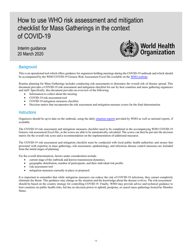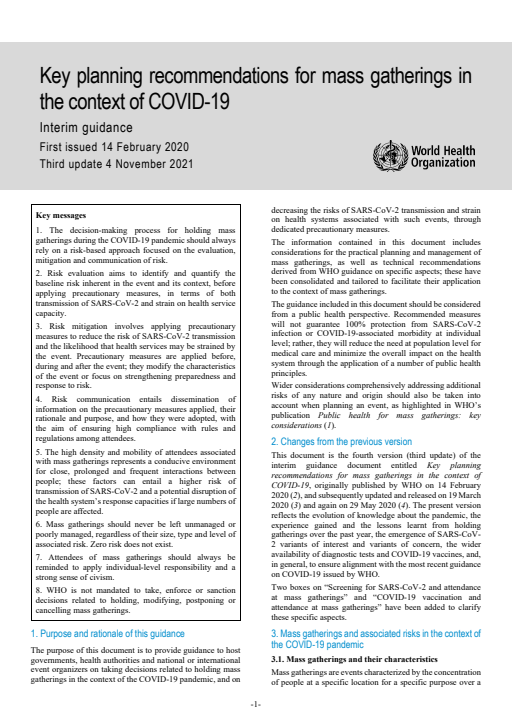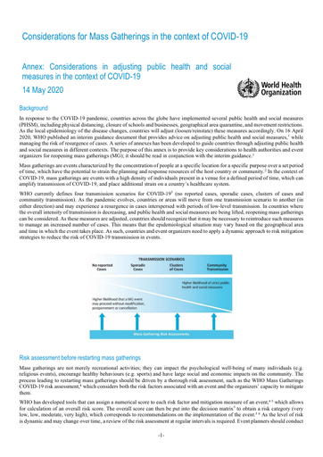 "The purpose of this document is to provide guidance to host governments, health authorities and national or international event organizers on taking decisions related to holding mass gatherings in the context of the COVID-19 pandemic, and on decreasing the risks of SARS-CoV-2 transmission and strain on health systems associated with such events, through dedicated precautionary measures.