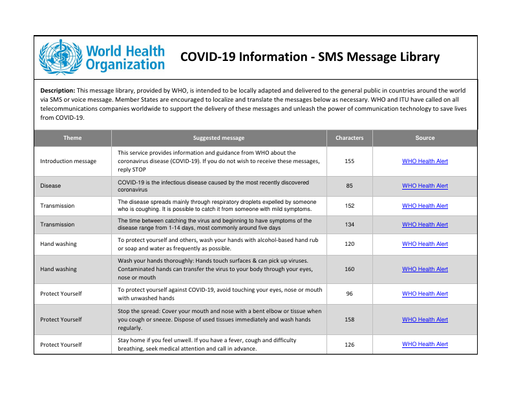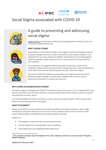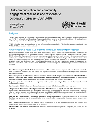 This document provides WHO checklists for risk communication and community engagement (RCCE) readiness and initial response for novel coronaviruses (nCoV) recently identified in Wuhan, China (2019-nCoV). The objective of this document is to provide actionable guidance for countries to implement effective RCCE strategies which will help protect the public’s health in the early response to nCoV. This document includes recommended RCCE goals and actions for countries preparing for nCoV cases and for countries that have confirmed -nCoV cases.