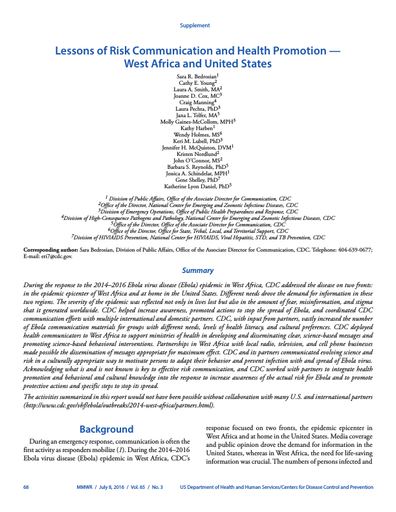 This article discusses the risk communication strategies used by the U.S. CDC in West Africa and the United States during the 2014-2016 Ebola epidemic and concludes with a summary of the lessons learned.