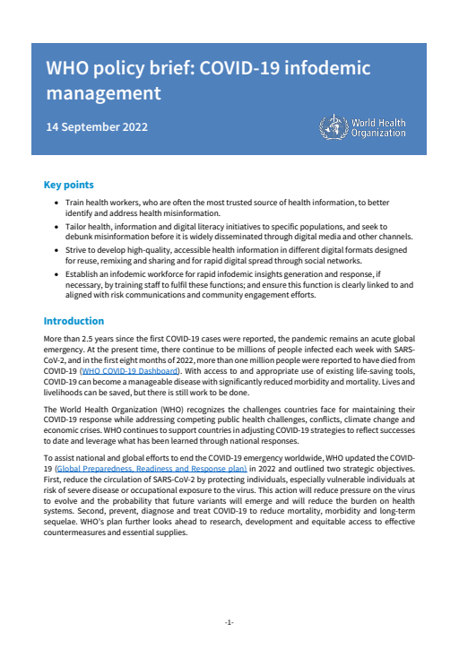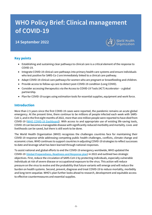 The purpose of this policy brief is to provide a concise summary of information and considerations to ensure optimal management of influenza during the COVID-19 pandemic. It addresses key issues policymakers may face, including potential co-circulation of influenza and SARS-CoV-2, differentiation between influenza and COVID-19 in patients and planning influenza prevention and control interventions. The document also includes links to detailed technical guidance and other resources regarding the intersection of influenza and COVID-19, including monitoring the situation, preventing seasonal influenza, reducing severe complications and mortality, protecting specific populations and communicating and engaging with the public