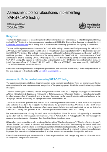 This tool has been designed to assess the capacity of laboratories that have implemented or intend to implement testing for SARS-CoV-2, the virus that causes coronavirus disease (COVID-19). The tool is a shortened version of the 2012 Laboratory assessment tool that is widely used to assess national laboratory systems and the capacity of laboratories.