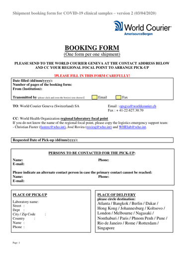 In this document, WHO outlined the instructions about the shipment mechanism to expedite and cover the costs of the shipment of clinical samples from patients with suspected COVID-19 from the country of collection to one of the WHO reference laboratories providing confirmatory molecular testing for COVID-19.