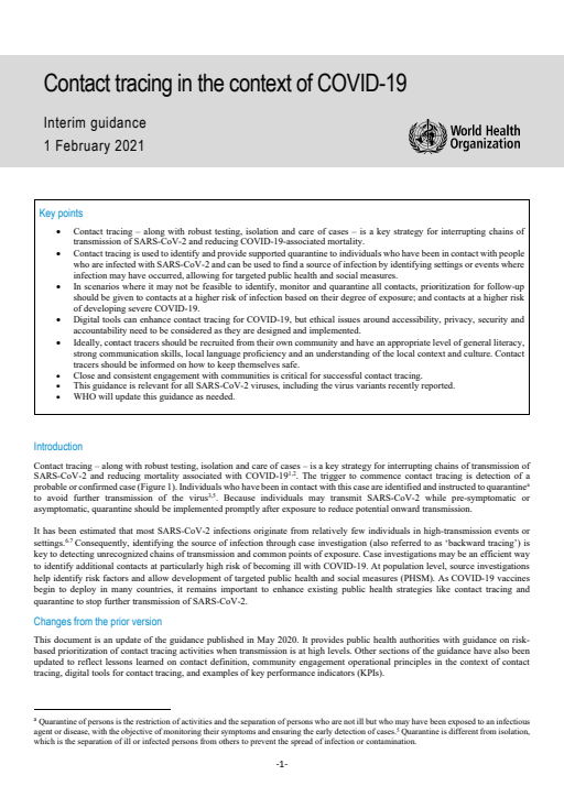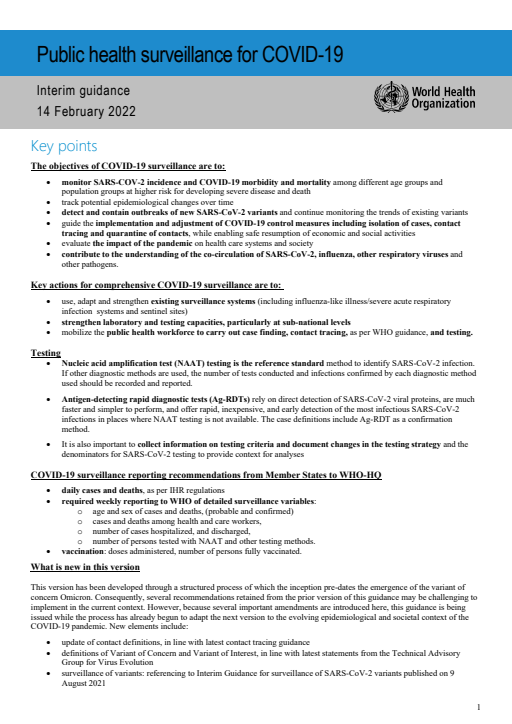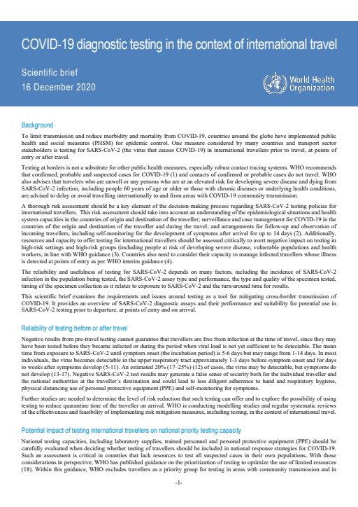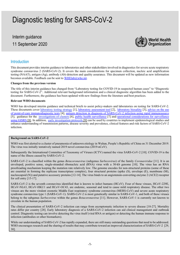 This document provides interim guidance to laboratories and other stakeholders involved in diagnostics for severe acute respiratory syndrome coronavirus 2 (SARS-CoV-2). It covers the main considerations for specimen collection, nucleic acid amplification testing (NAAT), antigen (Ag), antibody (Ab) detection and quality assurance. This document will be updated as new information becomes available. Feedback can be sent to WHElab@who.int.