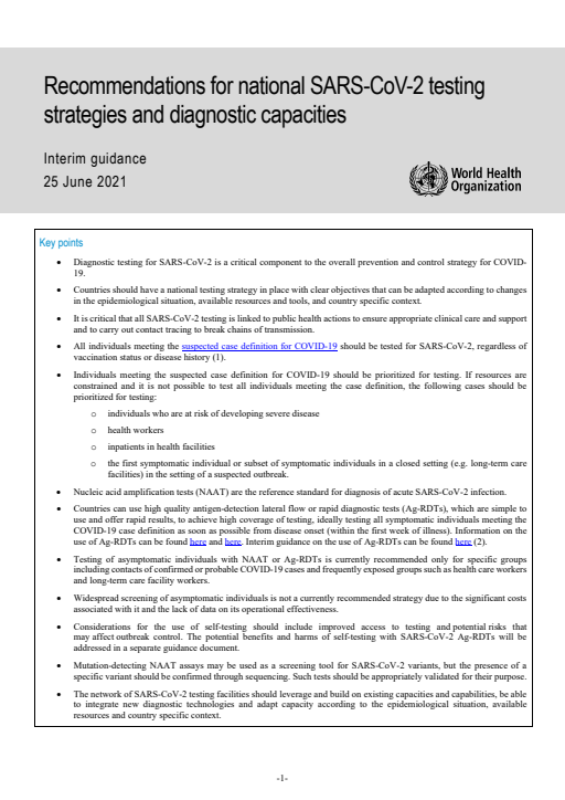Recommendations for national SARS-CoV-2 testing strategies and diagnostic capacities