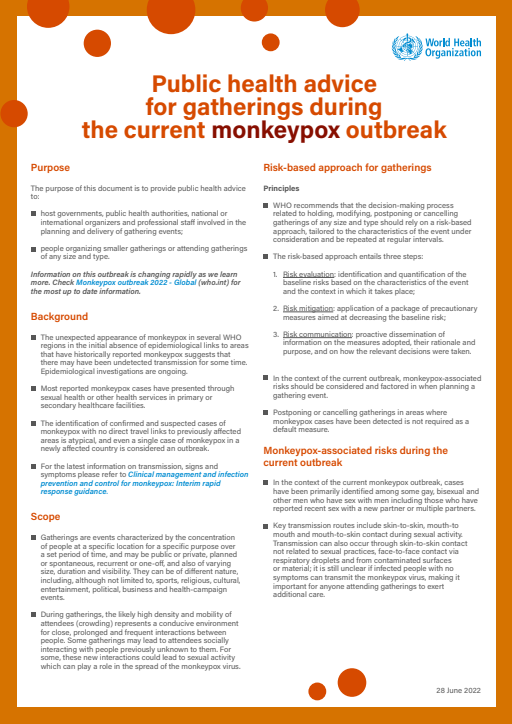 "The purpose of this document is to provide guidance to host governments, health authorities and national or international event organizers on taking decisions related to holding mass gatherings in the context of the COVID-19 pandemic, and on decreasing the risks of SARS-CoV-2 transmission and strain on health systems associated with such events, through dedicated precautionary measures.